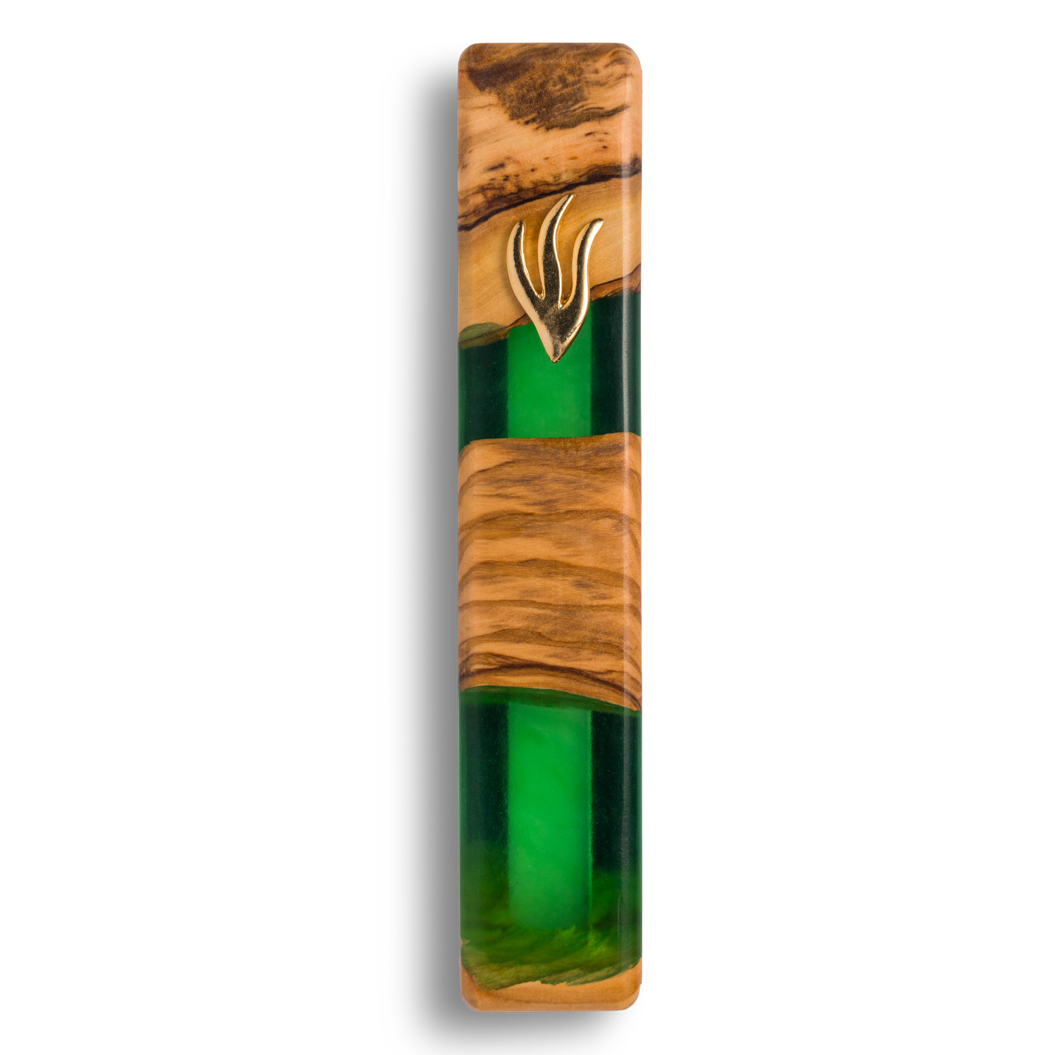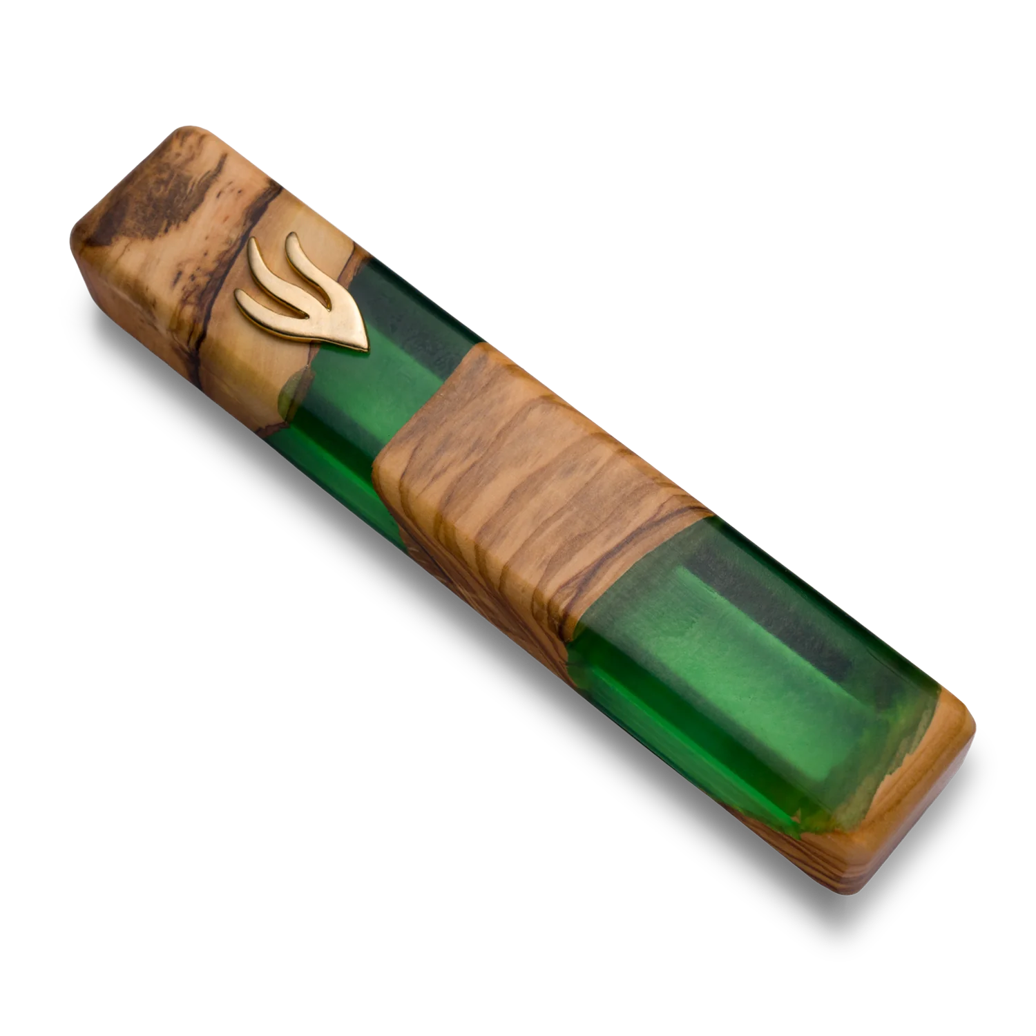 This handcrafted mezuzah case is made of richly grained olive wood and luminous green resin, highlighting the contrast between organic texture and contemporary design while adding a distinctive touch to any space.
